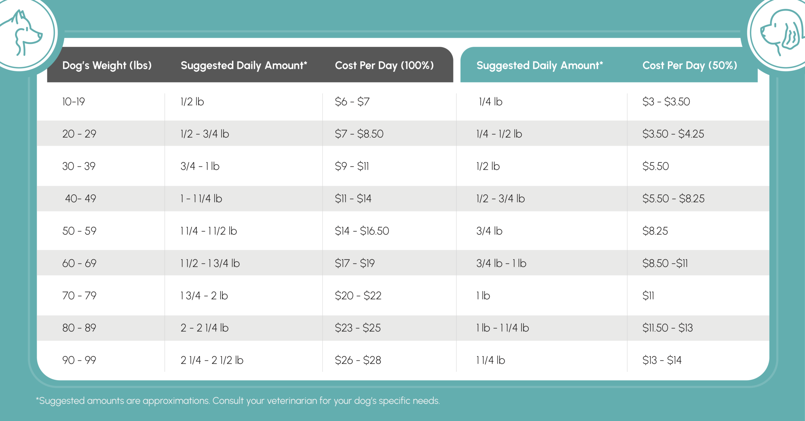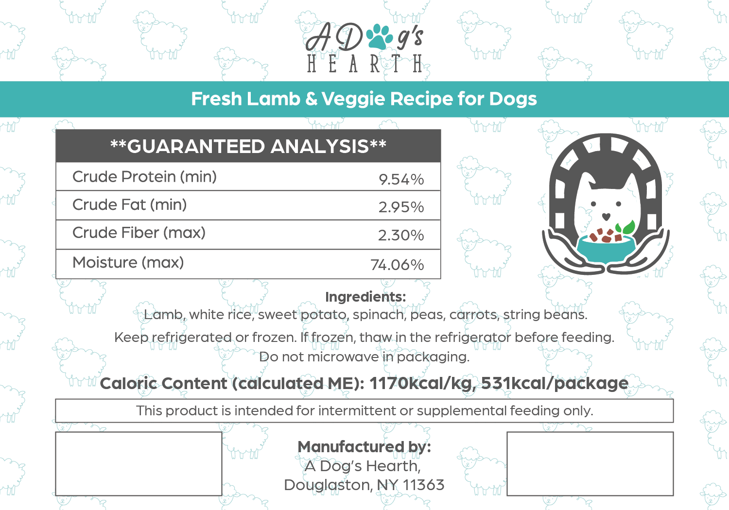 We offer portion guidance for two simple feeding styles: feeding A Dog’s Hearth as your dog’s full daily meal at 100%, or incorporating it at 50% alongside their current diet as a wholesome topper or mix-in. Either way, your dog gets the benefit of real, all-natural ingredients prepared with care.